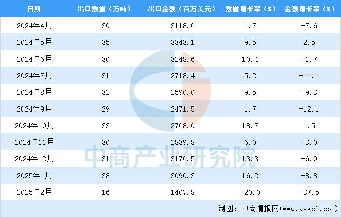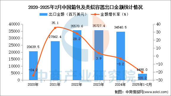 从金额方面来看,2025年1-2月中国箱包及雷同容器出口金额4498百万美元,同比下降20。2%。